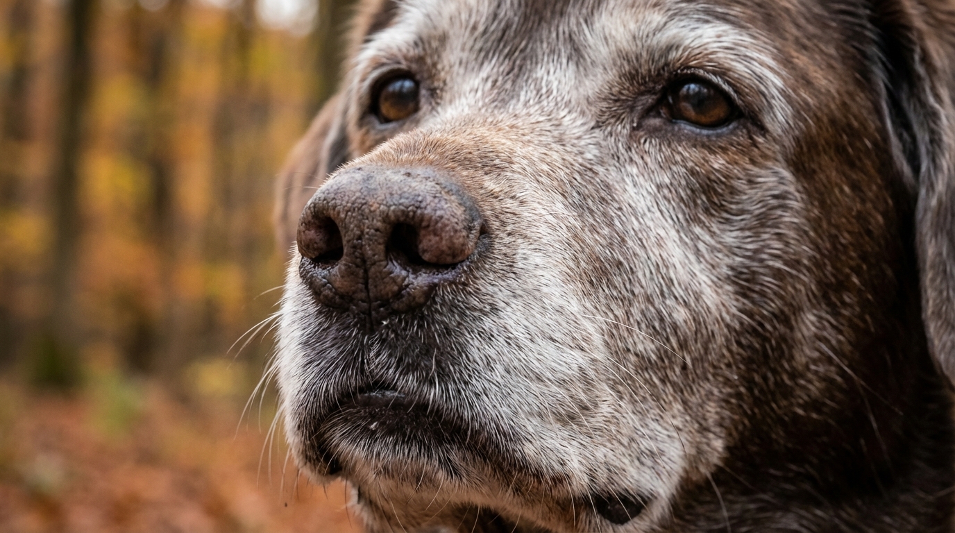 - Le pelage et la peau : L'apparition de poils blancs (grisonnement) commence généralement par le museau et le contour des yeux. La peau peut aussi perdre en élasticité et le poil devenir plus terne ou sec.